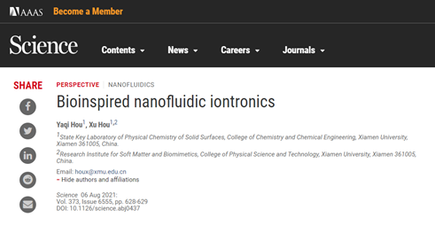 2021年8月6日,我院侯旭教授团队受美国《科学》期刊邀请,以“Bioinspired Nanofluidic Iontronics”为题发表了Perspective文章,剖析新兴的仿生纳流离子学在未来人工智能、脑机接口技术中的巨大潜能(Science, 2021, DOI: 10.1126/science.abj0437)。文章重点介绍了近年来纳流离子学的发展历程,提出了仿生科学将成为纳流离子学发展的新趋势,并展望了仿生纳流离子学在人工智能、脑机接口与类脑智能等跨学科交叉领域的广阔应用前景。