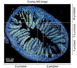 杭纬课题组首次设计了具有三通结构的样品剥蚀池,从而将微透镜光纤激光采样技术与ICP-MS相结合,搭建了LA-ICP-MS成像平台,该装置可以实现低至400纳米空间分辨率的质谱成像,对生物组织和单细胞内的多种化学物质进行可视化探测,还易于实现可调分辨率的成像模式。以同一片小鼠小肠剖面组织为研究对象,获得了从500纳米至10微米空间分辨率的药物分布成像图片。利用高分辨模式的成像,能够更直观、精准地描绘出小肠组织内微小的细节和药物的分布,从而揭示小肠对药物的吸收和作用机理。