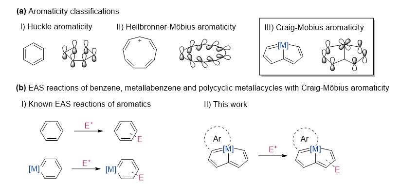 芳香亲电取代反应作为芳香化合物的特征反应,是证明芳香性的重要实验判据之一,也实现芳香化合物衍生化的重要合成方法。Craig-Möbius芳香化合物是指碳原子与杂原子形成d-p共轭的一类芳香化合物,已有许多合成实例。但此前尚未发现Craig-Möbius芳香化合物的芳香亲电取代反应。