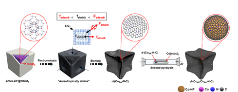 在催化剂制备中,首先在ZnCo-ZIF前驱体表面包裹SiO2涂层。由于ZnCo-ZIF比SiO2层软得多,热膨胀特性的差异使两者在热解过程中发生各向异性收缩,导致ZIF骨架结构外部产生局部应力,从而使CoN4活性位点发生原子级结构变形,形成了变形的钴单原子碳氮催化剂d-(CoSA-N-C);然后,利用气相热扩散方法将乙酰丙酮钴升华到d-(CoSA-N-C)上,得到含有变形碳层协同的复合活性位的催化剂d-(CoNP/CoSA-N-C)该制备方法不仅能够形成CoNP-CoN4复合活性位点,也有效地增加了Co-N4活性位的总体密度。实验和DFT计算结果均表明,CoNP-CoN4复合位点和变形碳层上的CoN4位点均能有效促进O2的解离吸附,增强氧自由基的吸附,抑制H2O2的形成,极大地减少了催化剂碳层的腐蚀,提高了催化剂的ORR活性和耐久性。此外,由于催化剂具有丰富的介孔结构,在活性位周边形成了更多的三相边界,有效提高了O2的传质和电荷的传输效率,从而提高了PEMFC的功率密度,在2 bar条件下Pmax-H2-O2达到1.207 W cm-2。