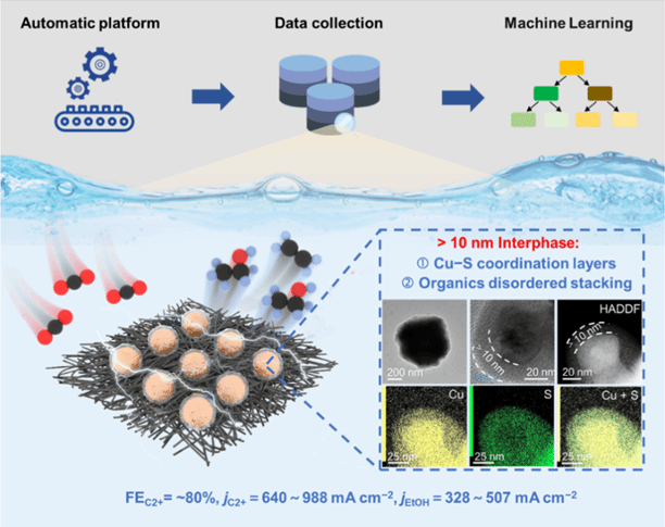 汪骋课题组与谢顺吉、王野教授团队将界面相概念扩展至电化学CO2转化领域。通过对有机分子修饰的CuOx催化剂展开细致研究,发现在高乙醇选择性的催化剂体系中,分子修饰的CuOx上会形成一种厚度超过10 nm的金属-有机界面相层,这一发现与传统上认为的单层分子吸附有所不同。为了进一步深入研究,研究团队借助自动化实验平台,进行了1080组CO2RR实验,对 180 种含 N/O/S 端基(如胺、硫醇和N-杂环卡宾)或不溶于水的分子修饰剂进行了全面筛选。同时,结合统计分析和机器学习方法,识别出了促进乙醇及多碳(C2+)产物选择性的关键官能团。研究表明,这些促进乙醇/C2+产物的分子修饰剂,能够稳定地在Cu或CuOx表面诱导金属-有机界面相的形成,并通过对Cu配位环境、CO2RR反应中间体以及界面水结构有效调控,显著提升了催化剂的CO2RR性能。此外,研究团队利用性能最佳的乙醇/C2+产物促进剂(1,8-辛二硫醇)对11种CuOx基催化剂进行了功能化处理,验证了这一修饰策略的普适性,最终开发出两种C2+产物法拉第效率接近80%的电催化剂,其乙醇分电流密度分别达到328和507 mA cm−2。该工作揭示了金属-有机界面相在CO2RR制乙醇/C2+产物过程中的关键作用,为CO2转化技术的发展提供了新的研究方向。