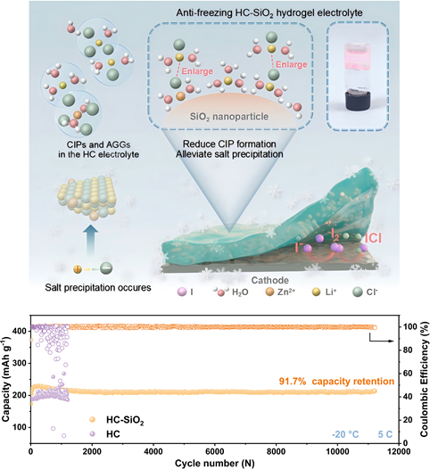 基于此,赵金保教授/杨阳副教授团队通过将SiO2纳米颗粒直接分散到高盐浓度电解质(HC)中,开发出一种新型的抗冻水凝胶电解质。表面带负电荷的SiO2纳米颗粒能与阳离子和水发生分子间相互作用,促使均匀透明的水凝胶的形成。根据 Bjerrum离子对形成理论,这些相互作用有助于增大离子对中阴、阳离子间的距离。实验和理论计算表明,该水凝胶电解质不仅能破坏水的氢键网络(抑制冰核形成),同时SiO2与阳离子的相互作用可显著降低紧密离子对和聚集体的比例,使高浓度电解液的凝固点降至-60.7 °C。此外,离子相互作用的减弱,提升了离子活度和离子电导率,进而提升了I+/I2转化反应的动力学性能。最重要的是,基于该水凝胶电解质的Zn-I2电池在-20 °C下不仅完整实现四电子转移过程,展现高达490.9 mAh g-1的比容量,还在高倍率条件下实现超过11,000 圈的循环寿命。这一成果为研发实用化的低温Zn-I₂电池提供了重要思路。