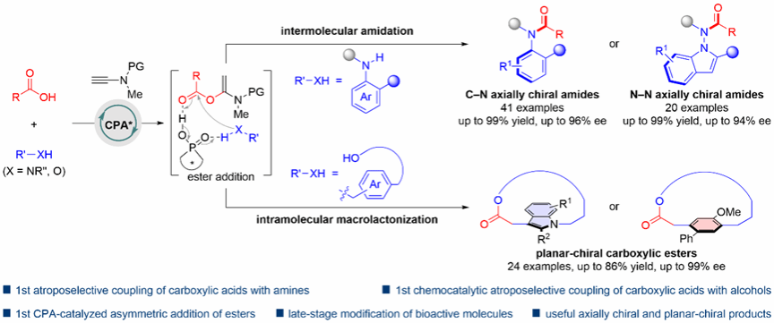 羧酸是一类廉价易得的基本化工原料,在化学、生物及材料等领域具有广泛的应用。羧酸与胺/醇的缩合是有机化学中的基础转化,但其催化不对称反应一直是合成化学中的挑战性课题之一。目前仅有的例子主要通过动力学拆分及酶催化(仅一例)来实现。阻转异构体是不对称催化、生物活性分子及材料中的常见骨架。除传统的C-C轴手性骨架外,C-N轴手性酰胺、N-N轴手性酰胺和平面手性骨架的合成较为罕见。因此,通过简便方法实现各类阻转异构体的普适性构筑的新策略具有重要价值。