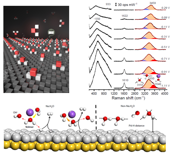 该工作利用课题组发明的电化学原位SHINERS 技术(Nature, 2010, 464, 392-395),在析氢反应(HER)过程,原位监测钯单晶电极/溶液界面水分子的构型及其动态变化过程。研究发现,电极/溶液界面除了已知的含有氢键的水分子之外,还有一类与阳离子键合的水分子。后者在阳离子和负电极电势协同作用下,更为有效地排布成有序的结构。这类界面水分子比氢键水分子更加接近电极表面,可以提高其和电极表面间的电荷转移效率,极大提升HER反应速率。提高阳离子的浓度和价态会进一步增加界面区有序水分子的含量,进一步提高HER反应速率。研究还发现单晶电极的晶面结构和电子结构都将影响阳离子键合水分子的含量和HER反应速率,证实了阳离子键合水分子加速HER反应速率具有普适性。该研究从单晶模型体系出发,深入认识界面水分子结构对电催化反应过程的调控机制,解决了困扰电化学领域的长期难题,为提升电催化反应速率提供了一种新的策略。