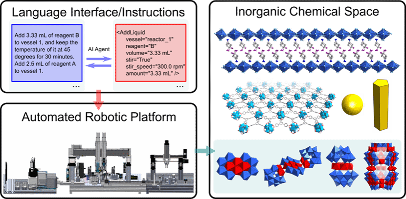针对这一挑战,团队开发一种结合AI驱动机器人系统与自然语言处理能力的全新化学合成平台,显著提高了实验流程的灵活性与效率。该平台整合了模块化自动化硬件、大语言模型(LLM)与AI copilot(AI助手),使化学家能够通过自然语言直接指导合成实验,实现从“想法”到“实验”之间的自动化转换。系统成功合成了四大类无机材料(配位化合物、金属有机框架、纳米颗粒、多金属氧酸盐),验证了其通用性和可靠性。同时,借助AI copilot的人机协同能力,研究者得以开展复杂的实验设计与实时优化,突破了传统闭环系统的局限。在对Mn-W-oxo团簇的探索中,该平台不仅发现了多个新结构(如Mn₄W₁₈、Mn₈W₂₆等),还展现出AI辅助实验设计、迭代优化和结构多样性挖掘的强大能力。