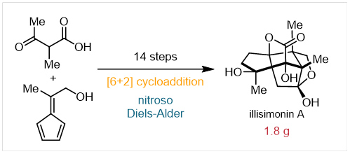 高阶环加成反应(涉及>6π电子的环加成)是构建中环及多环体系的高效方法。2024年,陆钊洪课题组创新性地运用[6+2]环加成反应,高效简洁地完成了复杂二倍半萜分子Bipolarolide D的首例不对称全合成(J. Am. Chem. Soc. 2024, 146, 14427.)。本研究基于[6+2]环加成策略,以14步,1.4%的总收率实现了八角属倍半萜天然产物Illisimonin A的克级规模全合成。关键转化包括(1)富烯的[6+2]环加成反应,快速构建线性的5/5/5三环骨架,(2)富烯的分子内烷基化,构建桥接环戊烷,(3)亚硝基-Diels-Alder反应,精准调控氧化态,(4)后期钌催化的氧化内酯化反应。