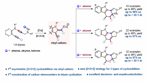 近日,我院叶龙武教授课题组在基于炔烃转化的杂环合成方法学研究方面取得重要进展,相关成果以“Copper-Catalyzed Asymmetric [2+2+2] Cycloaddition of Diynes via Vinyl Cations”为题在线发表于Angew. Chem. Int. Ed.