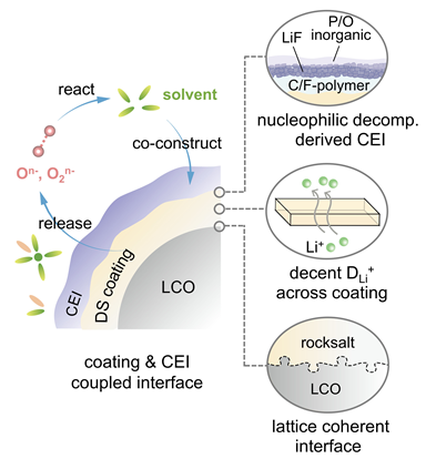随后,课题组运用一系列能够探测电极表界面组分与结构的表征手段(如原位表面增强拉曼光谱、飞行时间二次离子质谱、电子能量损失谱),揭示了DS包覆层的作用机制:(1)在LCO正极与DS包覆层的界面处,两者相似的氧阴离子框架促进了晶格共格界面的形成;(2)DS包覆材料本身表现出优异的Li⁺扩散动力学,且不影响LCO的本征容量和倍率性能;(3)在正极与电解质的界面处,DS包覆层释放的活性氧物种与氟化电解液发生亲核反应,构建出更稳定且有序的富LiF的正极电解液钝化膜。