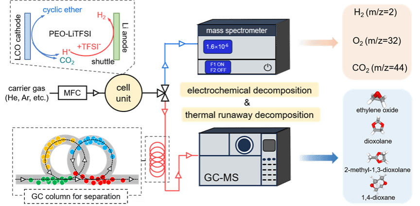 基于此,本研究创新性地结合在线质谱(MS)与气相色谱质谱联用技术(GC-MS),系统研究了LCO正极/PEO基聚合物电解质体系在电化学循环和热失控两种场景下的界面反应及分解产物动态演化行为。该研究实现了对永久性气体(如H2、O2、CO2)及环醚类中间产物(如1,4-二氧六环、环氧乙烷、二氧戊环、2-甲基-1,3-二氧戊环)的精准分离与识别,揭示了PEO电解质在复杂工况下的分解路径。该工作为高比能固态电池界面稳定性与热安全设计提供了全新机理认识和评估方法,为下一代高性能PEO基聚合物电解质与正极材料的合理设计奠定了理论基础。