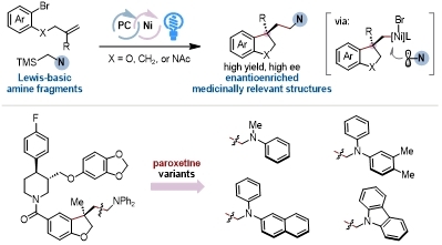 含胺手性季碳中心是药物分子的重要结构单元,但其催化不对称合成一直是合成化学的挑战性课题。不对称烯烃双官能团化反应是模块化构建季碳立体中心的重要策略。然而,传统烯烃双官能团化反应经常依赖于有机金属亲核试剂或化学计量还原剂的使用,在机制上难以实现含胺片段在季碳中心的不对称引入。因此,开发新的催化策略和催化机制以实现含胺季碳三维骨架的不对称构筑具有重要意义。
