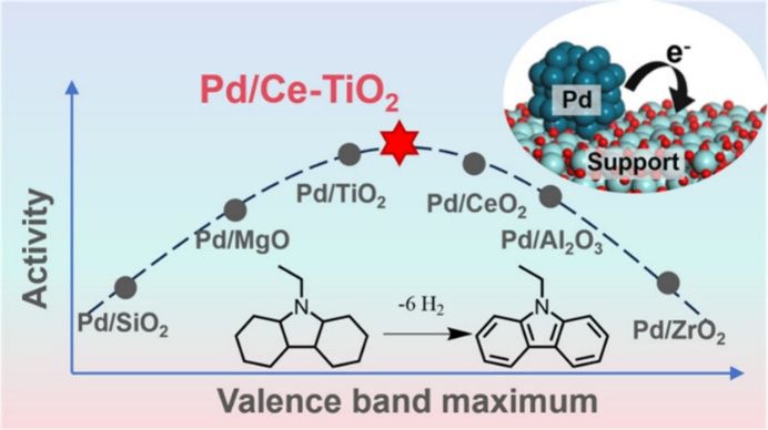 液态有机储氢材料因其高安全性和高氢储存密度,被认为是未来氢能存储与运输的重要载体。其中,十二氢化-N-乙基咔唑的高效脱氢是实现氢能可逆利用的关键科学挑战。针对传统钯基催化剂在低温下活性不足的问题,通过构筑尺寸均一的钯纳米颗粒体系,系统考察了不同金属氧化物载体对Pd电子结构及其催化行为的调控作用,发现氢气生成速率与Pd电子态之间呈“火山型”关系。进一步通过谱学与动力学研究发现,不同脱氢阶段对金属电子态的需求存在差异,来源于C-H键的活化与产物脱附的共同影响,并由此提出双活性位点接力催化策略,利用复合氧化物载体构筑具有双电子环境的Pd/CeTiOx催化剂,实现氢气生产速率达到114.8 h⁻¹,显著优于文献已报道体系。该研究从金属-载体电子调控角度出发,深入解析了活性中心电子效应与催化速率之间的内在关联,并发展了对定量比较半导体和绝缘体等各种基底上金属-载体电子相互作用具有普适性的电子特征描述符——价带最大值(VBM),为高效产氢催化剂的理性设计提供了重要理论依据与新思路。