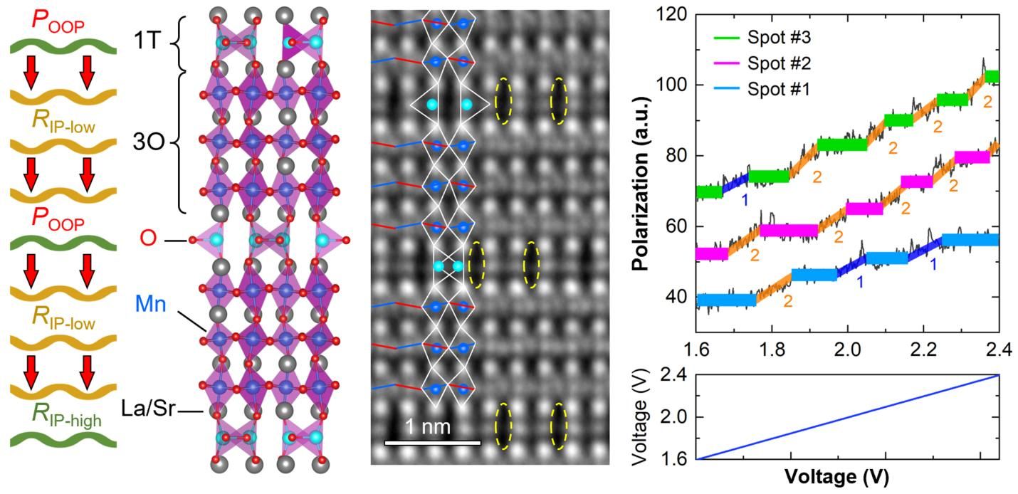 在传统信息存储的范式中,信息存储的密度提升依赖器件尺寸的缩小。然而,当尺寸逼近原子级时,量子隧穿等问题不仅会导致成本激增,还会使得存储性能变得不稳定,进而引发存储失效的严重后果。与之不同的是,多极化态存储策略另辟蹊径,它通过挖掘铁电材料所具备的多重稳定极化特性(如 - Ps1, Ps2, Ps3 …),巧妙地让单个存储单元能够承载更多的信息(如 32 态对应log2(32) = 5 比特/单元)。因此,这一策略能从 “信息密度而非物理尺寸” 的全新维度突破现有存储技术的极限。