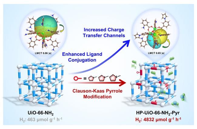 金属有机框架(MOFs)材料被广泛应用于多相催化领域,其催化性能的提升在很大程度上依赖于对其结构的精确设计。MOFs所具有的可调孔道结构和骨架特征,为实现催化微环境的精确调控提供了独特的平台。本工作报道了一种应用于光催化产氢的MOF微环境精确调控策略。该工作基于经典的Clauson-Kaas反应,对分层多孔(HP)的缺陷型HP-UiO-66-NH2的-NH2官能团进行分子水平上的共轭拓展修饰,成功构筑了吡咯功能化的HP-UiO-66-NH2-Pyr。实验结果与理论计算综合分析表明,缺陷工程与官能团共轭扩展策略能够有效调控MOF晶体结构内的微环境,从而改变载流子的热力学与动力学行为,最终实现光催化性能的显著提升。这种显著提升主要归因于以下三个方面的优势:(1) HP-UiO-66-NH2-Pyr能高效吸收可见光,生成光生电子所需的能量更低;(2) 缺陷引入与晶体内共轭增强的协同作用为电荷传输提供了额外通道,有效抑制了电子-空穴复合并延长了激发态电子寿命;(3) 在光照激发下,吡咯中的氮原子向Zr-O簇供电子,从而加速质子还原反应。理论计算进一步表明,共轭结构的增强不仅降低了激子结合能,还显著强化了配体向金属电荷转移(LMCT)过程,从而降低了光催化产氢中的质子吸附能。本研究强调了通过精细的共轭修饰调控UiO-66-NH2晶体结构可显著提升其光催化性能,为高效光催化体系的精确设计及其在催化等多领域的拓展提供了新思路。