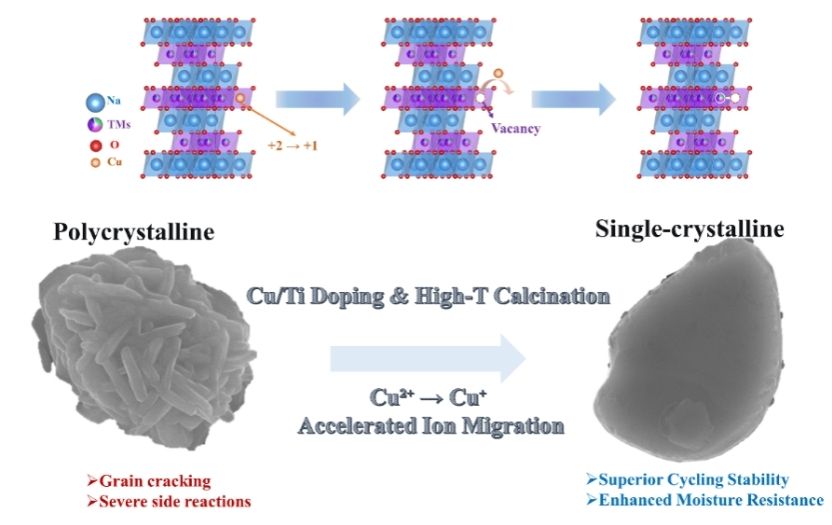 本工作不仅提供了一种高效、可规模化合成单晶钠离子电池层状正极材料的创新策略,更重要的是从原子迁移和空位效应的深度,阐明了铜诱导单晶生长的内在物理化学机制,这一机理对其它体系单晶电极材料的开发具有普适性的指导意义。