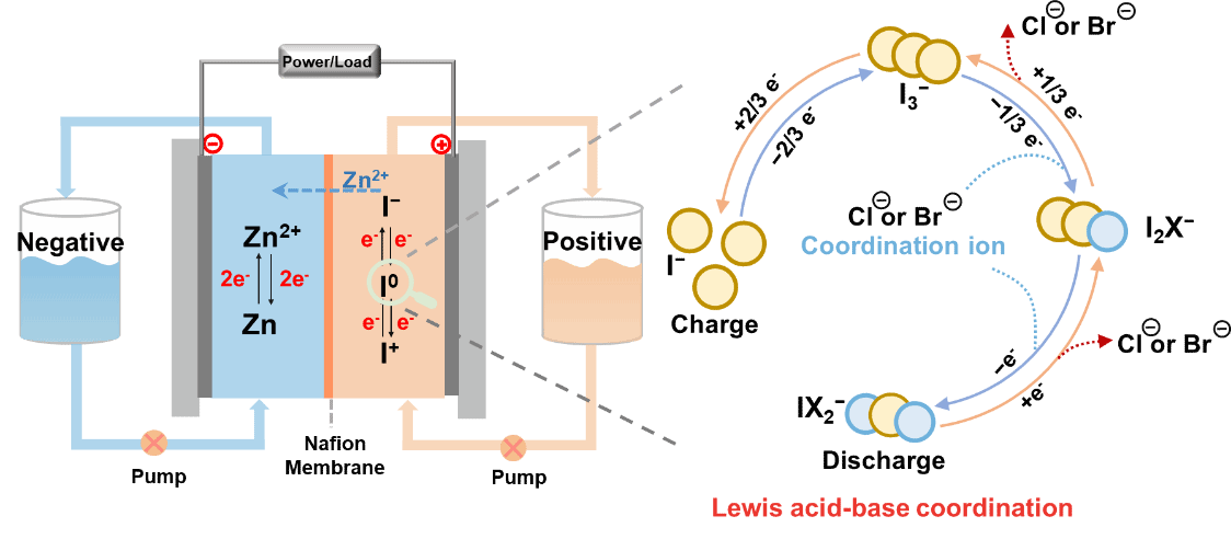 为解决可再生能源间歇性问题的大规模储能需求,氧化还原液流电池(RFBs)凭借功率与能量解耦的特性展现出独特优势。碘基液流电池由于碘元素适用于多电子转移反应,结合其高溶解度、快速动力学特性、低成本及相较溴氯更优的环保性,因此备受关注。然而传统碘电池在充电过程中会形成碘化物(I3−)导致实际容量仅为理论值的三分之二,严重制约了能量密度。实现容量的根本性突破,需要驱动碘超越传统的反应迈向涉及I+等高价位态的多电子转移过程。这亟需通过精准的溶液环境调控来稳定高活性碘中间体、抑制副反应并促进可逆转化。