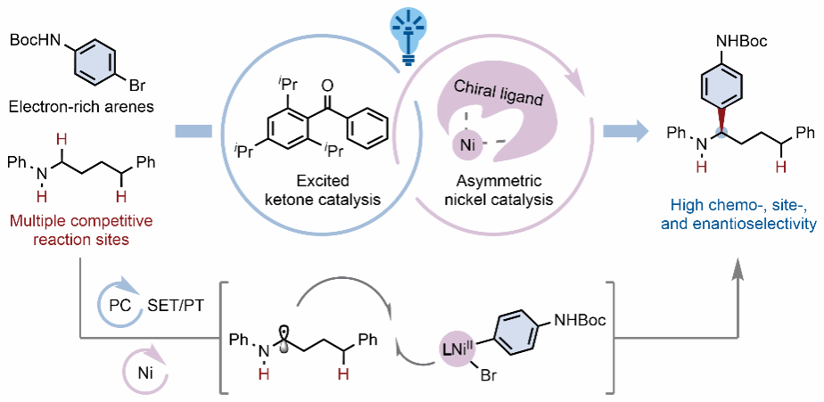 针对这一挑战,霍浩华教授课题组创新性地为简单二芳基酮光催化剂引入位阻基团,将其重塑为基于单电子/质子转移(SET/PT)活化模式的新光催化剂,巧妙地攻克了N-烷基苯胺单电子活化的逆向电子转移(BET)难题。通过结合手性镍催化剂,成功发展了一种高效的氨基a-C(sp3)-H键不对称芳基化和杂芳基化新方法,首次实现了链状和环状N-烷基苯胺的C(sp3)-H不对称自由基偶联。该不对称金属-光催化新体系,不依赖于额外导向基团进行立体诱导,能够兼容电性丰富多变的(杂)芳基卤化物和烯基卤代物,包括极具挑战性的富电子芳基卤代物。它展示出极好的官能团兼容性,可以大幅简化一系列复杂药物分子的不对称合成,同时实现化学、位点和对映选择性的高效控制。
