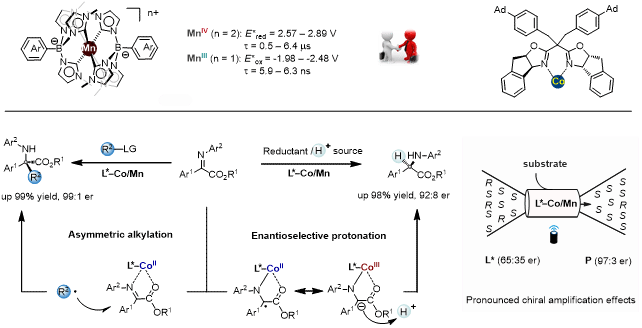 利用储量丰富的3d过渡金属开发高效、精准的不对称光催化体系是绿色合成化学的前沿方向。锰元素具有价态多变的特性,其配合物在可见光催化中的应用面临重要挑战:复杂的激发态行为与快速的消旋化倾向,使得反应路径与立体化学难以精准调控,尤其与手性催化体系的协同机制鲜有报道。