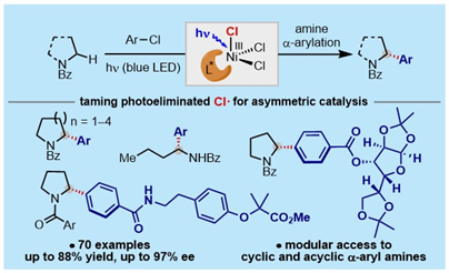 针对这一难题,霍浩华教授课题组结合他们前期在sp3 C-H键不对称官能团化研究方向的技术积累(JACS, 2020, 142, 19058; Nat. Commun. 2021, 12, 3536; ACS Catal. 2021, 11, 13567; Org. Biomol. Chem. 2021, 19, 9407; Review: Coord. Chem. Rev. 2022, 460, 214479.),首次发现光裂解产生的活泼氯自由基可以被驯服用于不对称催化,进而应用于a-芳基胺和a-杂芳基胺的高效不对称模块化合成。该工作利用光裂解普通的手性三氯化镍配合物产生的氯自由基作为氢原子转移(HAT)试剂攫取简单易得的氮杂环或氮-烷基酰胺的sp3 a-C-H键,所产生的a-氨基自由基可以被手性镍催化剂捕获和商品化来源广泛的芳基氯代物发生不对称交叉偶联反应。该方法不需要使用额外的氧化剂或者金属试剂,使用简单的、商品化来源广泛的芳基氯代物和胺类化合物作为反应试剂,具有广谱的底物普适性和出色的对映选择性,而且适用于一系列复杂的生命活性分子和药物分子的后期修饰。机理研究表明镍催化剂不同寻常地扮演着多重角色:实现了氯自由基的产生,a-氨基自由基的捕获,交叉偶联反应和不对称立体诱导。这一特征也进一步体现了该转化的独特性和新颖性。