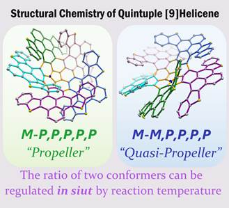 多重螺烯通常存在多种不同的稳定构象,但是随着多重[n]螺烯的重数和螺数n值的增大,合成的挑战性亦随之增大。迄今为止,杂多重[9]螺烯的合成及其多种不同构象的研究仍属空白。前一个工作合成得到的氮杂五重[7]螺烯其螺数7恰好和报道的记录持平,针对能否将杂多重[n]螺烯的螺数n值扩大,以及如何提高其构象异构体个数的问题,团队采取了硫原子掺杂的研究策略,通过与前一个工作类似的3步有机反应实现了硫、氮原子共掺杂的五重[9]螺烯(SNQ9H)的合成。SNQ9H不仅代表了螺数最高的杂多重螺烯,而且还包含两个稳定的构象异构体(SNQ9H-1和SNQ9H-2),更有趣的是,通过改变反应温度可以实现两个构象异构体的比例调控。低温有利于SNQ9H-1的生成,高温有利于SNQ9H-2的生成,这为多重螺烯的不同构象的调控提供了一种新方法。理论计算表明,同时生成两种不同构象异构体主要由反应动力学控制,而硫原子掺杂也是能同时获得两种构象的原因之一。X-射线单晶结构证实了SNQ9H-1和SNQ9H-2分别呈现螺旋桨和准螺旋桨的拓扑结构以及M-P,P,P,P,P 和M-M,P,P,P,P构象。由于中心氮杂巴基碗碗深的不同,其bowl-to-bowl的翻转能分别为16.7和10.3 Kcal/mol,分别表现出类似sumanene和corannulene的动力学行为。