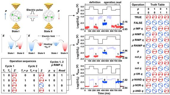 单个金属富勒烯分子器件这种非易失的双稳态性质和电场控制偶极翻转的高动态特性使其在基于存算一体器件的逻辑运算操作方面具有重要潜力。为验证这一思路的可行性,该工作根据布尔逻辑方程设计施加在单分子器件两个电极之间的脉冲电压序列,并在演示逻辑运算操作前对分子状态进行定义,解决了单分子器件电导初始值的不确定性问题,从而通过存算一体操作首次在实验上实现了单分子器件14种逻辑运算的原理性验证。英国兰卡斯特大学Colin Lambert教授合作开展的密度泛函理论计算表明,非易失性存储行为来自富勒烯笼中 [Sc2C2] 基团的偶极重定向,且两端电极间强度和方向可控的强电场能够通过降低不同构型间的能垒和热力学优势构型以实现对偶极的翻转行为的电场控制。