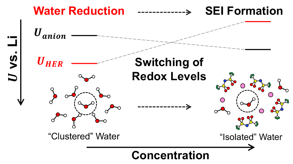 开发具有宽电化学窗口的不易燃电解质对于储能设备非常重要。盐包水电解质(Water-in-Salt Electrolytes,WiSE)由于其广泛开放的电化学窗口和高稳定性而引起人们的极大兴趣。先前的理论研究表明,水分子溶剂化层的变化导致水的HOMO-LUMO带隙打开,从而导致在WiSE 中形成基于阴离子还原的固体电解质界面相(Solid Electrolyte Interphase,SEI),并扩大了水系电解液的电化学稳定窗口(electrochemical stability window,ESW)。然而,决定电解质 ESW 的不是分子轨道的能量,而是溶剂化氧化还原对的氧化还原电势。例如,与 8.7 eV 的带隙相比,水的ESW仅为1.23 V。缺少溶剂重组的重要贡献,轨道能量与氧化还原自由能的区别可能是几个电子伏特。另外氢析反应(Hydrogen Evolution Reaction,HER)不仅取决于电子能级,还取决于溶液中质子的化学势。因此,决定水系电解质稳定性的是WiSE中锂盐阴离子和水分子的特殊溶剂化环境和氧化还原特性,而不是轨道能量。然而,计算电解质中水分子和阴离子的氧化还原电位仍然是一个挑战。