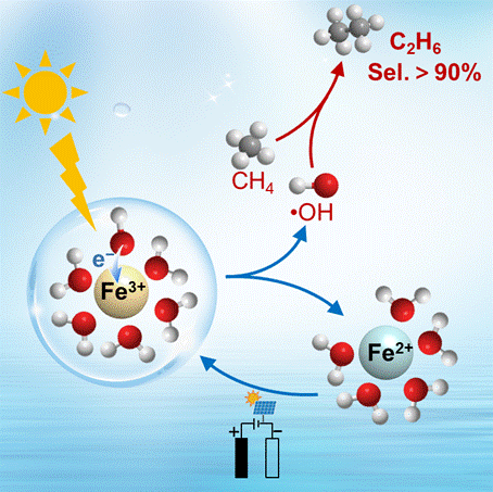 研究团队将NOCM反应的乙烷和氢气生成过程解耦,发展了光化学甲烷偶联制乙烷耦合电化学制氢的NOCM新过程,通过独特配位结构的Fe3实现甲烷选择转化,而生成的Fe2+可用于低能耗的电化学析氢,实现太阳能驱动的Fe3+/Fe2+循环和CH4转化制C2H6和H2。在优化的反应条件下,C2产物选择性可达94%,生成速率优于已报道的NOCM光化学体系。独特的水合Fe3+离子结构([Fe(H2O)5OH]2+)是保证反应活性和选择性的关键,其在光激发下可产生分子内电荷转移跃迁,使Fe3+还原成Fe2+,同时释放出羟基自由基(•OH)。后者可选择活化甲烷C−H键生成甲基自由基(•CH3),进而经由C−C偶联生成C2H6。通过耦合阳极Fe2+氧化和阴极还原水产氢,不仅可以实现Fe3+/Fe2+循环,还可以同时获得H2,并显著降低电解制氢能耗。该工作巧妙地构建了节能、可持续的铁离子循环系统用于高选择性CH4偶联制C2H6和低能耗制氢,为设计和构建经济、高效的CH4利用和制氢体系提供了新思路。