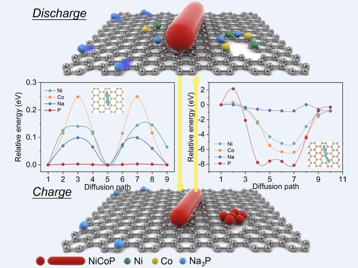 有鉴于此,研究团队以过渡金属化合物NiCoP@C为研究对象,采用原位透射电镜(in situ TEM)、XANES和原位XRD等表征手段,揭示了影响过渡金属化合物负极的ICE和循环性能的本质原因是化合物中不同原子迁移能力的差异和放电产物的空间分布。DFT理论计算结果说明材料组分不同原子迁移能力的差异的本质原因以及无序碳对活性材料的稳定效应。发现无序碳对活性组分的锚定效果远大于对Na+的作用。这一机理的发现为进一步通过调控NiCoP@C电极中的无序碳实现对电池初始库伦效率以及循环性能的改善提供了指导。这一概念为理解构效关系和性能改进策略背后的本质原因提供了新的见解。
