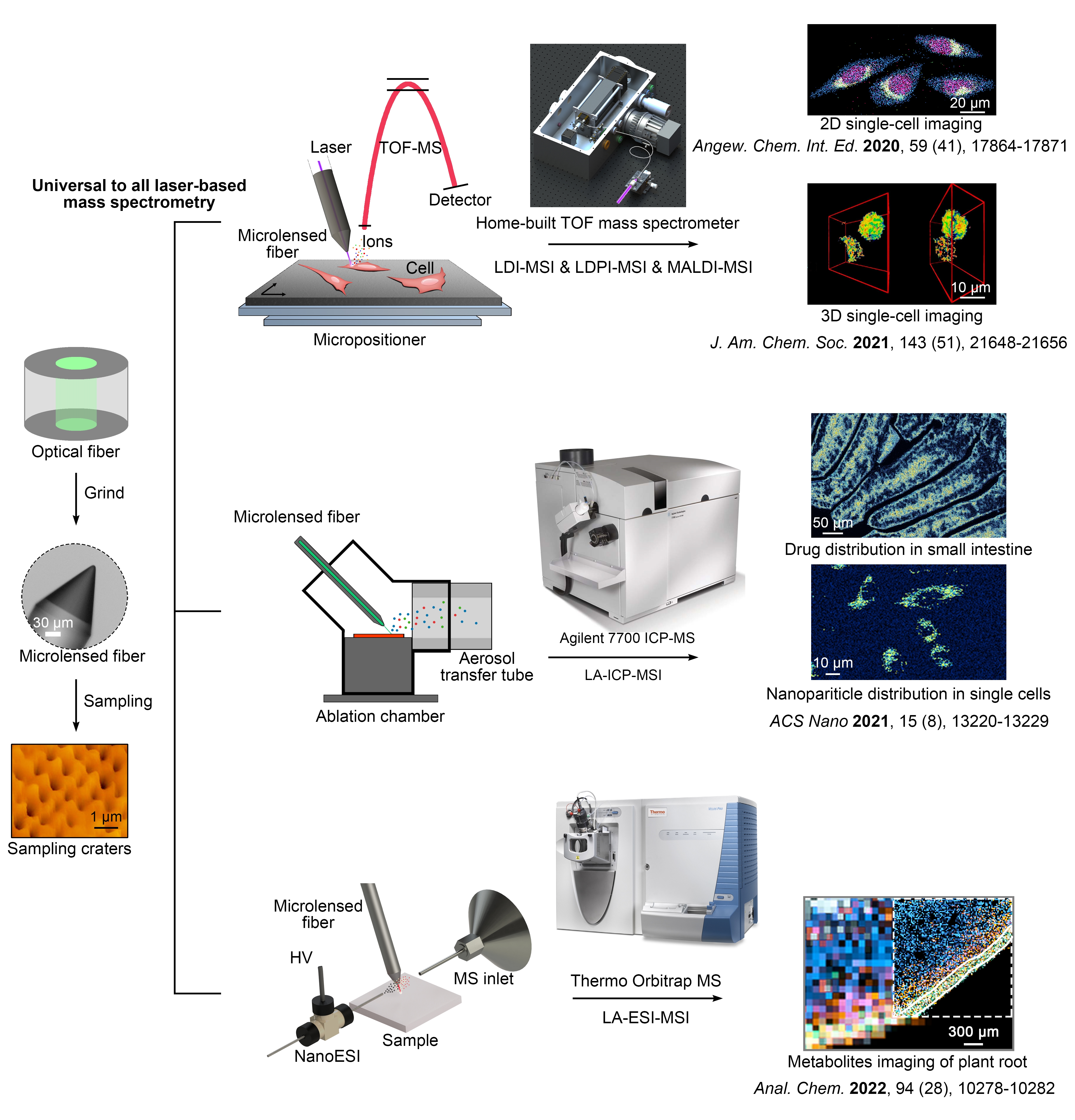 在连续两个国家自然科学基金重大科研仪器研制项目(21427813,22027808)的支持下,杭纬教授课题组在2020年首次研发出了基于微透镜光纤的激光采样技术,最优空间分辨率可达300 nm。与实验室自行搭建的质谱平台相结合,成功地获取了抗癌药物在单细胞内的分布和转移过程(Angew. Chem. Int. Ed. 2020, 59, 17864-17871)。通过将微透镜光纤与商品化的ICP-MS相结合,课题组将LA-ICP-MS的空间分辨率提高至400 nm,相比于现有的技术提高了至少一个数量级,并进行了单细胞和小鼠小肠组织的成像分析(ACS Nano 2021, 15, 13220-13229)。通过引入157 nm的后电离激光和基于嵌入式均匀圆形聚苯乙烯微球的三维定位方法,微透镜光纤带来的高空间分辨能力可用于准确重构还原药物在单细胞内的三维分布(J. Am. Chem. Soc. 2021, 143, 21648-21656),空间分辨率可达500 nm。斯坦福大学的Richard N. Zare课题组将微透镜光纤与商品化仪器平台相结合,将现有的LA-ESI-MS成像分辨率提高了近一个数量级(Anal. Chem. 2022, 94, 10278-10282)。