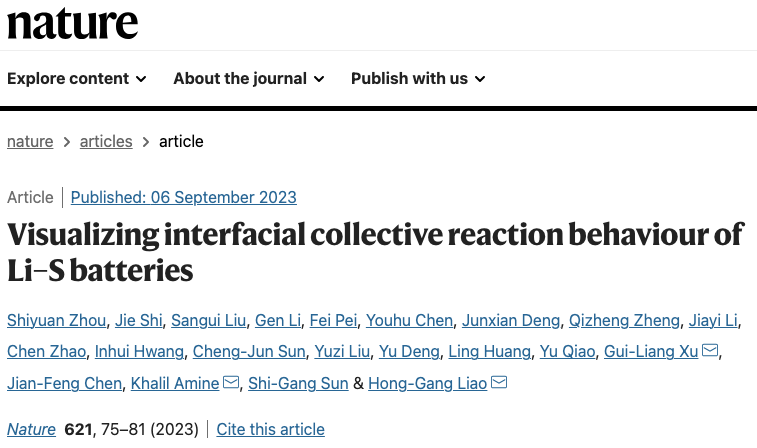 北京时间9月6日23时,厦门大学廖洪钢教授、孙世刚院士,与北京化工大学陈建峰院士,美国阿贡国家实验室徐桂良、Khalil Amine研究员团队合作,在国际顶级学术期刊Nature杂志上发表了题为“Visualizing Interfacial Collective Reaction Behaviour of Li-S Batteries”的最新研究成果。该项成果基于自主研发建立的高时空分辨电化学原位液相透射电子显微系统(EC-TEM),对锂硫电池界面反应过程进行了深入研究,首次发现了锂硫电池电荷储存聚集反应新机制。