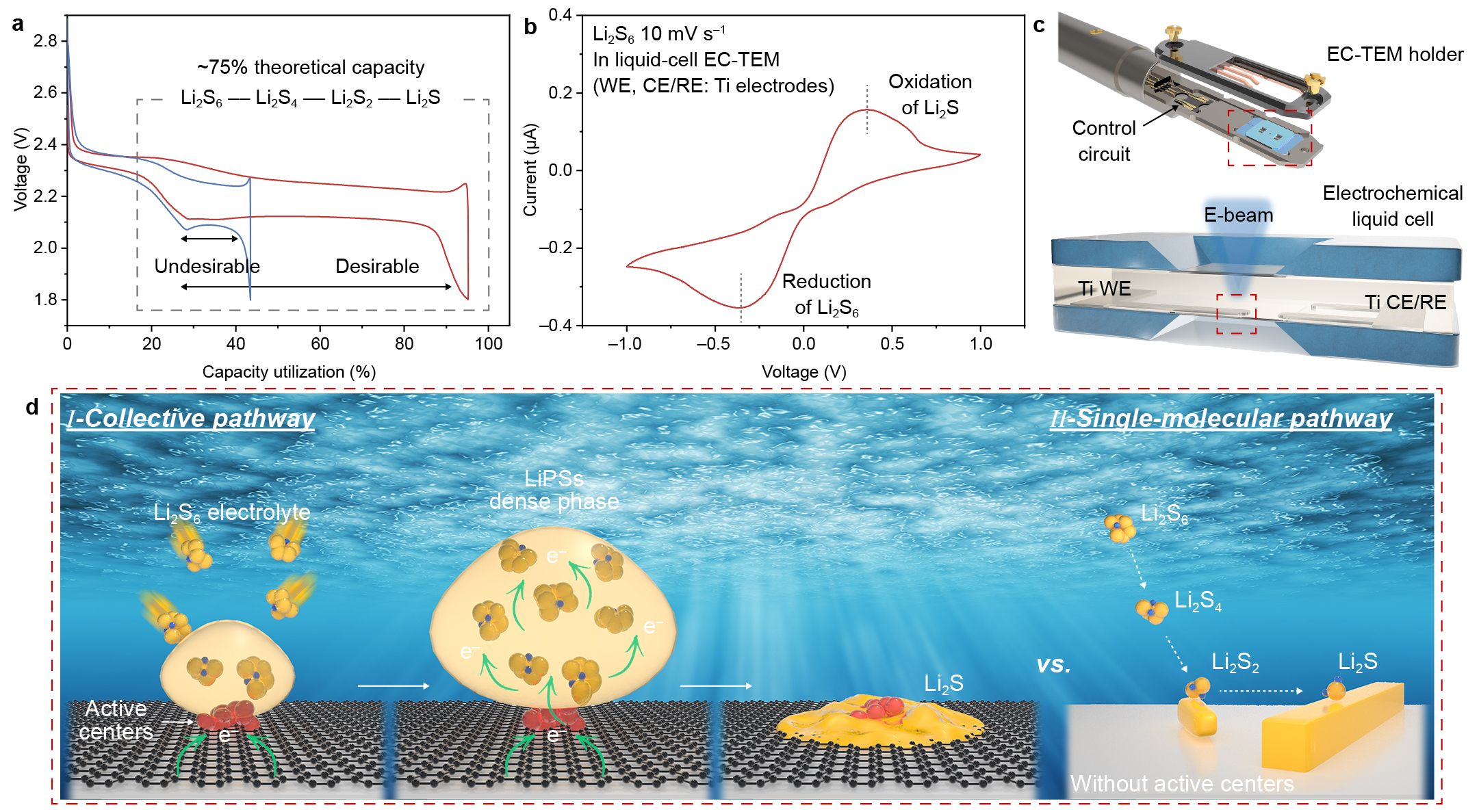 锂硫电池具有极高的能量密度(2600 Wh kg–1)和更低的成本,然而受限于传统原位表征工具的时空分辨率的局限和锂硫体系的不稳定性和环境敏感性等挑战,当前仍然缺少原子/纳米尺度上对锂硫电池界面反应的理解。为此,研究团队建立了高时空分辨电化学原位液相透射电镜技术,耦合真实电解液环境和外加电场,实现了对锂硫电池界面反应原子尺度动态实时观测和研究。