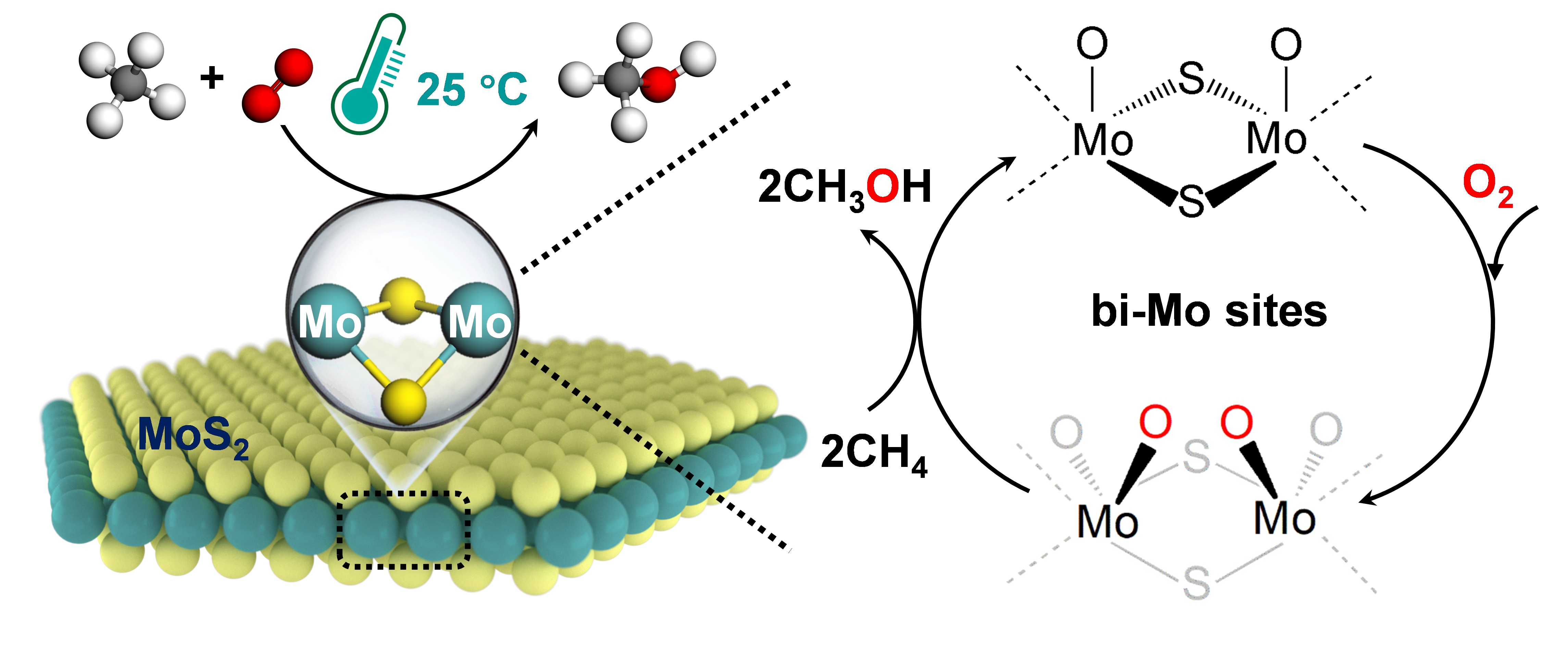 邓德会团队长期聚焦二维催化材料的表界面调控与甲烷等能源小分子的催化转化研究(Nat. Catal.,2021;Chem Catal.,2022;Nano Energy,2021;Angew. Chem. Int. Ed.,2020;Chem,2018;Nat. Commun.,2017;Energy Environ. Sci.,2015)。本工作在此基础上,通过模拟自然界中甲烷单加氧酶的双核金属中心,构筑了MoS2边硫空位限域的配位不饱和双Mo位点,实现甲烷与氧气室温直接催化转化制C1含氧产物。相比于之前报道的化学循环反应体系中复杂的氧气/甲烷分步变温活化和甲烷低转化率(<1%),该催化体系可在25 °C下实现甲烷与氧气一步直接转化为甲醇等C1含氧产物;甲烷的最高转化率可达4.2%,同时C1含氧产物的选择性大于99%,有效抑制CO2的生成。结合时间分辨原位表征与理论计算研究发现,MoS2边硫空位限域的配位不饱和双Mo位点可在室温下直接解离氧气分子形成高活性O=Mo=O*物种;该物种能够高效活化甲烷C-H键,进而将甲烷经由甲氧基中间体转化为C1含氧产物。该研究为开发甲烷与氧气室温催化转化过程提供了新思路。