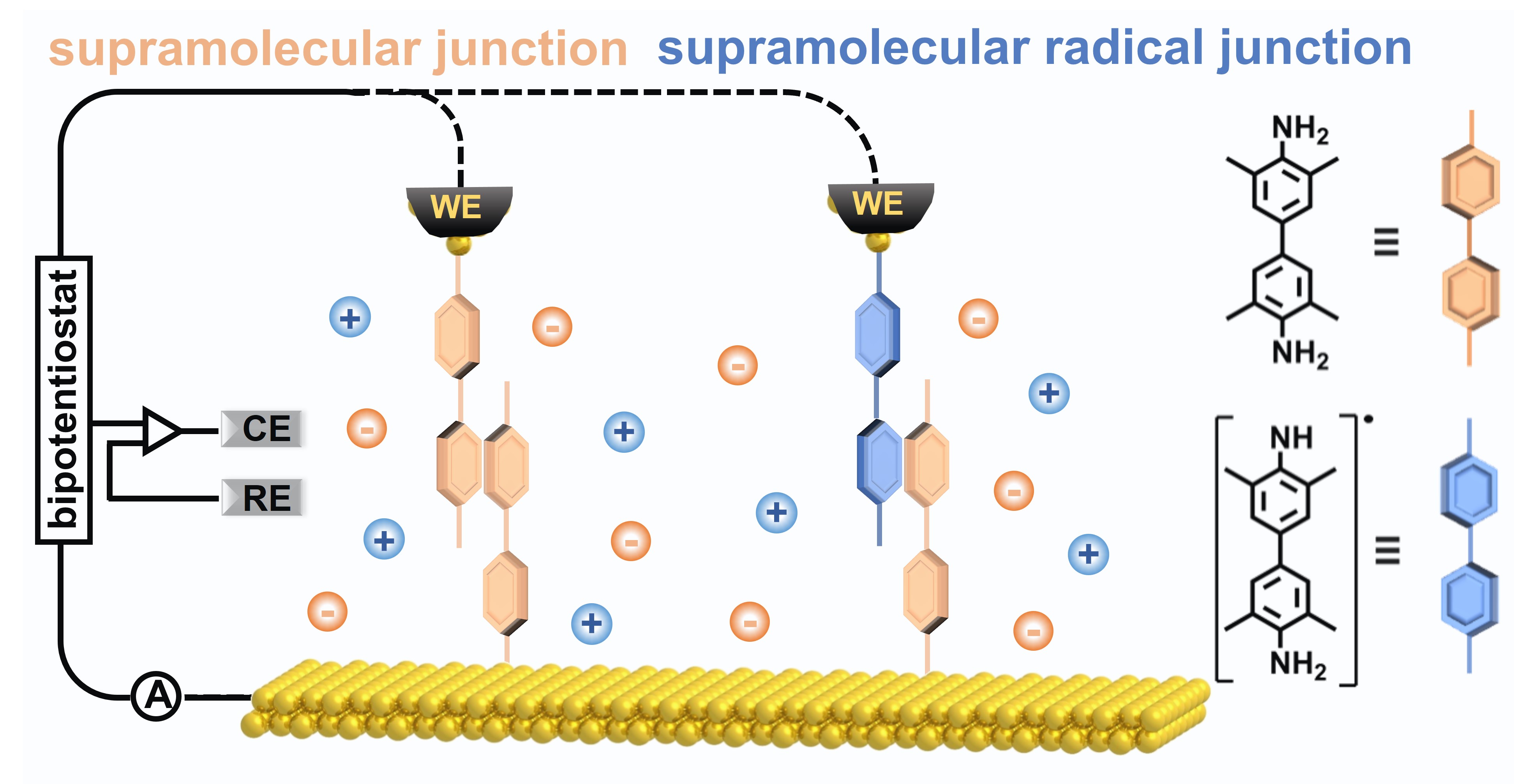 超分子自由基化学连接了超分子化学和自由基化学,将自由基引入单分子尺度的超分子结构中,为调控超分子自由基的电子结构和功能性质提供了全新机遇。虽然研究者们已经做出了许多努力来制备超分子结构,但由于在单分子水平上制备超分子自由基的挑战,对于通过超分子自由基的电荷输运特性的研究至今没有报道。