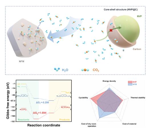 虽然各种钠离子电池正极的电化学性能已经在材料层面得到了深入的研究,但仍然缺乏从未来实际应用角度对材料进行评价和比较。特别是经常被忽视的空气稳定性,这不仅会影响电极的制造过程,而且会导致材料产生有害的结构变化。研究团队对近期商业化的两种正极产品NaNi1/3Fe1/3Mn1/3O2 (NFM)和Na3V2(PO4)3 (NVP)在环境气氛中的稳定性进行了评价,并研究其结构降解机制。理论计算和实验结果表明,由于NFM在空气中的化学反应热力学优先转化,当暴露在空气中时NFM的稳定性明显不如NVP。此外,拉曼谱图和X射线衍射结果表明,表面碱性杂质的产生加速了NFM的结构降解。因此,研究团队提出了一种简单的二次烧结策略,通过去除表面杂质并将表面产生的Na+重新嵌入到材料晶格结构中的方法来提高NFM的空气稳定性。原位XRD分析表明,经过二次烧结处理后的稳定晶体结构不仅有效抑制了NFM在空气中的化学转变,而且提高了循环稳定性(循环200次后容量保持率高达90.7%)。