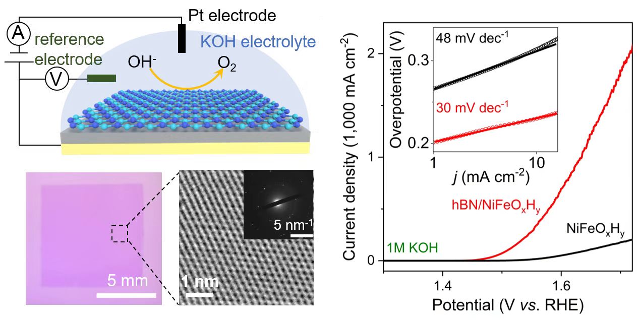 本工作选择的二维六方氮化硼(hBN)材料,表面高密度B-N键易于形成电子局域活性中心,优化OER反应中含氧物种的吸附。而且,尽管块体hBN是绝缘体,但当其厚度降低到单原子层时,电荷可通过隧穿快速传输。基于此,利用化学气相沉积法生长的厘米级单原子层hBN薄膜作为助催化剂,封装NiFeOxHy阳极,器件表现出超低的塔菲尔斜率(~30 mV dec−1),OER电流密度比单独NiFeOxHy提高10倍( 490mV过电位下达~2 A cm−2),并且可以在~2A cm-2的高电流密度下稳定运行超过150h。电极质量活性比商业化催化剂高出五个数量级。实验和理论计算结果表明,OER性能的提升归因于hBN助催化剂上含氧中间体的吸附,hBN/NiFeOxHy表面局域电子促进了含氧中间体的去质子化过程。同时,此类单原子层hBN助催化剂可适用于多种常用OER电催化剂表面的封装,均可大幅提升电极性能。本工作发展了利用单原子层二维材料作为助催化剂的新方法,为深入理解电极表界面原子层反应机理以及精准调控机制提供了新的思路。