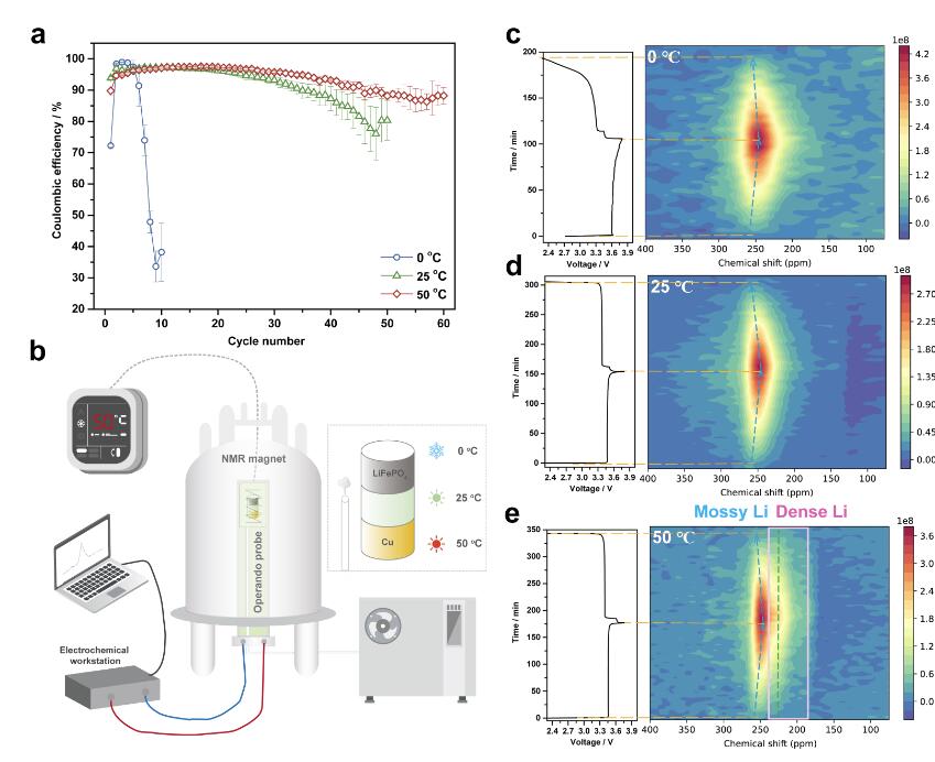 锂沉积/剥离过程微观结构演变的变温原位NMR研究。(a)LiFePO4||Cu电池在不同温度(0、25、50℃)下的库伦效率。(b)变温原位核磁共振装置。在不同温度:(c)0 ℃、(d)25 ℃和(e)50 ℃下,LiFePO4||Cu电池第一个循环期间的7Li原位NMR谱。