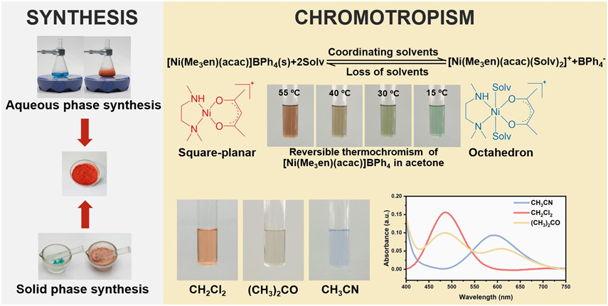 文献中有关“配合物[Ni(Me3en)(acac)]BPh4的合成及其溶剂/热致变色”实验融合了配合物的设计合成、结构、晶体场理论等基础理论知识的应用以及结构决定性质和性质决定用途的含义,富有教学意义,并贴合大一学生的知识基础。但其合成过程所用有机溶剂(乙醇、二氯甲烷、石油醚)种类较多、用量较大,并需要使用大一学生实验室通常不配备的回流装置和旋蒸仪等,且合成过程步骤较多、合成时间相对较长,有限的实验课时难以有效用于对配合物的溶剂/热致变色性质的研究及其变色机理的探讨等,面对大批一年级学生推广应用受到很大限制。