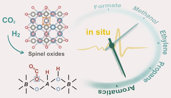 传统上CO2加氢制多碳化学品主要使用改性的金属基费托合成催化剂,但由于费托合成表面聚合机理的限制,其加氢产物分布宽,难以高选择性获得单一的烃类产物。王野教授团队近年来发展了用于精准调控产物选择性的金属氧化物-分子筛接力催化体系,在CO和CO2加氢高选择性制多碳化学品领域取得系列重要进展。本工作结合多种原位谱学表征,在原子层面上系统研究了尖晶石型金属氧化物催化CO2加氢制甲醇的反应网络,解析了CO2吸附/活化和H2解离的活性位,并揭示了表面碳物种和氢物种的演变规律。在此基础上,本工作进一步构建了一系列尖晶石-分子筛双功能催化剂,通过接力催化实现了CO2直接高选择性加氢制多种高附加值产物,如乙酸(48%)、乙烯(58%)、丙烷(80%)、丁烷(50%)、低碳烯烃(92%)和芳烃(70%),且选择性灵活可调,为CO2的选择性加氢转化提供了新策略。