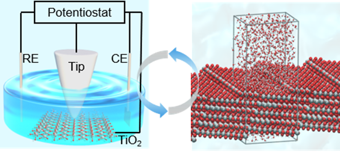 金属氧化物因其活性好、储量丰富,被认为是有前景的(光)电催化剂。其重要的应用场景如光催化水分解等多发生在水溶液环境中,因此对于氧化物-溶液界面结构的认识是至关重要的。然而,由于氧化物导电性差、样品原子级平整处理困难、成像电位条件难以确定等问题,氧化物-水界面的原位高分辨成像具有很大的挑战性。