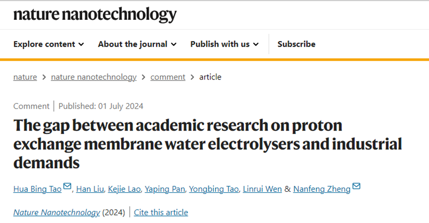 近日,我院郑南峰院士及陶华冰副教授研究团队应邀在Nature Nanotechnology期刊以“The gap between academic research on proton exchange membrane water electrolysers and industrial demands”为题发表评论文章(DOI: 10.1038/s41565-024-01699-x),深入探讨了质子交换膜电解水(PEMWE)技术在基础研究与工业应用之间存在的关键差距,并为未来研究方向提供一些思考。