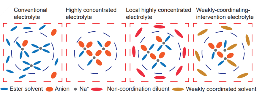 高压钠金属电池(SMBs)因高理论容量(约 1166 mAh g-1)、低电极电位(-2.714 V)以及钠金属资源丰富而被视为最有前途的储能系统之一。稳定的 SMBs 在很大程度上取决于阳极界面层(SEI)和阴极界面层(CEI)的组成和性质,而SEI和CEI的组成和性质则与所用电解质体系直接相关。因此,通过调节离子溶剂化结构来构建性能优异的SEI/CEI是电解质设计的重要原则。然而,电解质/溶剂化结构的设计原理及其对电化学性能的影响在方法和理论上都还很不成熟。