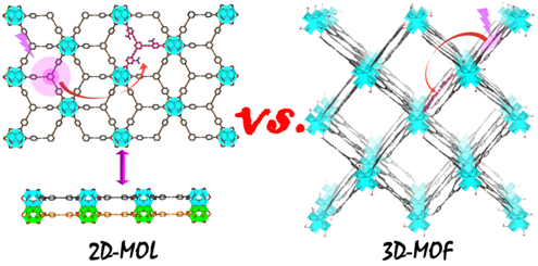 该研究通过荧光活性的三羧酸配体与同一金属离子在不同条件下反应合成了两种结构相关但维度不同的金属有机配合物:具超薄有序二维结构的金属-有机单层(2D-MOL)和三维的金属-有机框架(3D-MOF)。利用具相同结构及尺寸但不同光物理性质的三羧酸配体对两种材料掺杂,并通过稳态和时间分辨荧光研究其荧光猝灭过程,研究者对比了维度对单线态激子能量转移的影响。利用课题组之前提出的超越最近邻跳跃模型(J. Am. Chem. Soc.,2016, 138 (16), pp 5308–5315)对单线态激子在2D-MOLs和3D-MOFs上的能量转移进行模拟,与实验结果吻合。该研究也对不同维度的荧光放大猝灭给出了统一的理论描述。