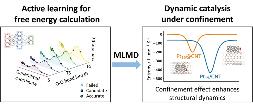 近日,我院程俊教授课题组,在基于机器学习分子动力学模拟与自由能计算方法的动态限域效应研究方面取得重要进展。相关研究成果以“Entropy in catalyst dynamics under confinement”为题发表在Chemical Science上(DOI: 10.1039/D4SC05399K)。