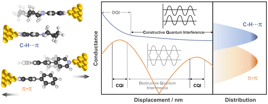 针对上述问题,课题组利用扫描隧穿裂结(STM-BJ)技术,构筑了具有C-H···π作用的超分子结,并在单分子水平上研究了分子间电荷传输的纳米尺度演化。实验结果表明,多重C-H···π作用的超分子结具有高效的电荷输运能力,其电导是π-π堆积超分子结的3.5倍。此外,π-π堆积超分子结的电导随分子间位移的增大表现出周期性的变化趋势,而C-H···π超分子结的电导随位移的增大先衰减,而后逐渐收敛。结合理论计算,他们揭示了超分子结电输运随分子间位移的演化机制,即π-π堆积会在相消量子干涉和相增量子干涉之间反复转换,而C-H···π堆积则从相消量子干涉转变为相增量子干涉并收敛。该工作揭示了C-H···π作用在电子输运和可调控性方面的重要潜力,为基于分子间相互作用的分子材料和器件的设计提供了新的思路。