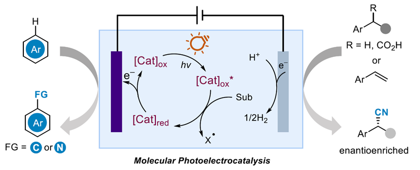 过去十几年间,随着合成效率与可持续性需求的日益增长,光催化和有机电合成凭借其绿色安全的特性,快速发展并成为了有机化学研究的两大热点。两大领域的融合催生了分子光电催化(Molecular Photoelectrocatalysis)这一新兴领域,它集光催化与电化学之所长,不仅拓宽了氧化还原电势范围,还使反应能在更温和的电极电势下进行。2019年,徐海超、Shannon Stahl和Tristan Lambert团队的开创性研究标志着分子光电催化的兴起,并迅速推动了该领域的发展。徐海超教授团队更是在2022年率先提出光电不对称催化概念(Nat. Catal. 2022, 5, 943),拓宽了不对称催化的边界。