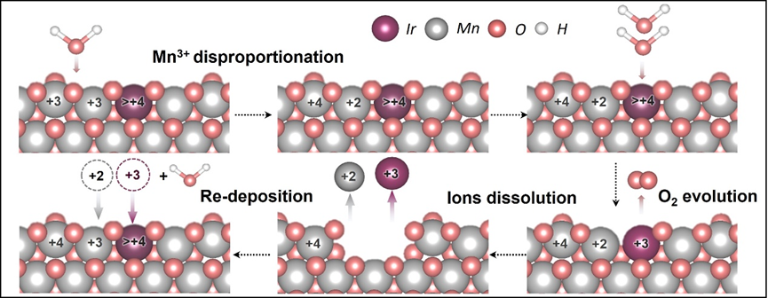 针对这一挑战,研究团队采用电氧化沉积法制备了铱掺杂二氧化锰(Ir/MnO2)的新型自支撑型气体扩散电极。实验结果表明,在酸性电解质中,合成的5.1% Ir/MnO2催化剂在三电极测试体系中不仅展现出优异的活性与稳定性(1650 h @100 mA cm−2),还能保持低Ir溶出量,且基于氧析出量和Ir溶出量比值的稳定性指数(2.9×108)高于目前文献已报道结果。同时,该催化剂在PEM电解池中能以1.0 A cm−2的电流密度稳定运行250 h,且Ir的负载量仅为~0.3 mg cm−2,低于传统PEM电解池中Ir的使用量(2-4 mg cm⁻2),具有应用潜力。进一步结合理论计算表明,Ir与Mn之间的电子相互作用导致高价态Ir物种的生成,促进了*OOH中间体的脱附,从而有效提升了反应活性。此外,对催化剂的稳定机制研究发现,在阳极电位的驱动下,溶出的金属离子能够以原位再沉积的方式实现催化剂的“自修复”,有效抑制了Mn和Ir在酸性介质中的溶出,从而显著延长了催化剂的使用寿命。