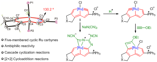 芳香性和环张力的协同作用使钌杂戊搭炔表现出独特的反应性。如其既可与亲电试剂反应也可以亲核试剂反应,表现出“变色龙”的双亲反应性。另外,钌杂戊搭炔还可与炔烃发生[2+2]环加成反应生成钌杂环丁二烯衍生物,首次实现了钌卡拜与炔烃的环加成反应。钌杂戊搭炔的合成及反应性研究进一步丰富和发展了金属卡拜化学。