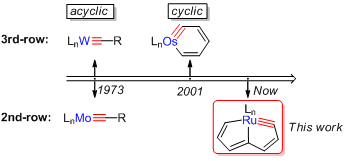 含过渡金属碳三键(M≡C)的金属卡拜化合物是许多有机反应的催化剂或关键中间体。对其合成及性质的研究是金属有机化学的热点之一。由于卡拜碳的sp杂化方式,大部分金属卡拜化合物均为链状结构(卡拜碳键角理想值为180 °),环内金属卡拜化合物因存在很大的环张力而难于合成。因此不难理解虽然链状金属卡拜化合物早在1973年已有报道,但环内金属卡拜直到2001年才得以实现,且目前金属中心仅限于第三过渡系金属。相对于第三过渡系金属卡拜化合物,第一、第二过渡系金属卡拜化合物的键能较小,因此稳定性更差,合成更加困难。