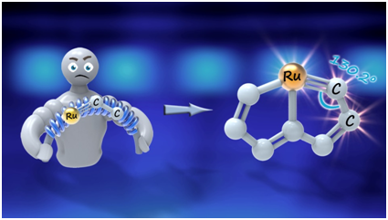 最近,夏海平教授课题组发展了由链状多炔(称之为碳龙)构筑碳龙配合物的高效方法(Nature Communications, 2017, 8, 1912),实现了锇杂戊搭炔/烯及其衍生物的一锅法合成。现在,他们把该方法进一步拓展到了第二过渡系金属钌,通过碳龙与市售的RuCl2(PPh3)3反应一锅合成了钌杂戊搭炔I。I为首例第二过渡系环内金属卡拜化合物。其金属卡拜碳键角仅为130.2 °, 偏离sp杂化碳理想键角近50 °C。虽然钌杂戊搭炔的卡拜碳键角极度弯曲,但其具有良好的稳定性,其固体样品可在空气氛下60 °C加热3小时保持不变。理论计算表明,芳香性是稳定钌杂戊搭炔的关键因素。