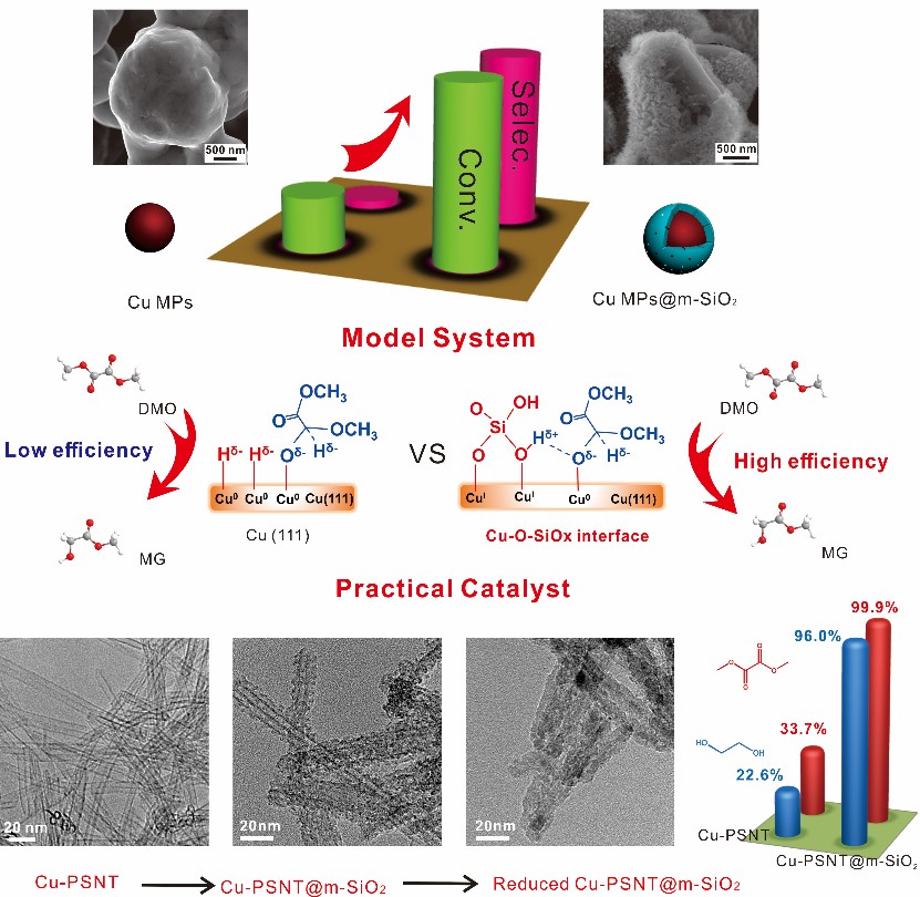 金属催化剂对化学工业及社会的发展起到举足轻重的作用。目前实用的金属催化剂几乎均为负载型的,因此在设计催化剂时,除需调控金属的形貌与尺度外,还可通过载体调控来控制金属和载体的相互作用。一直以来,人们认为金属-载体的强相互作用容易发生在活性金属与可还原性的氧化物载体(如TiO2、CeO2、Fe2O3等)之间,或是在易形成表面氧缺陷的难还原氧化物载体(如Al2O3, La2O3等)上,而SiO2则被认为是惰性载体,不易与金属纳米颗粒发生强相互作用,在催化过程中仅起到分散金属的作用。而在该项研究工作中,郑南峰教授带领的科研团队打破这个多相催化领域的“定式”。他们巧妙地通过在商业铜颗粒表面包裹介孔SiO2,构筑了Cu-O-SiOx界面。Cu-O-SiOx界面的存在,使得H2易在Cu-O-SiOx界面上形成Cu-Hδ-和SiO-Hδ+,带负电的Cu-Hδ-可亲核进攻酯基上的碳生成具有负电性的过渡态,而带正电的SiO-Hδ+物种则可有效稳定带负电的过渡态,进而促进酯基的氢化。SiO2包裹的Cu催化剂表观活化能(107 kJ/mol)比未包裹Cu催化剂(189 kJ/mol)降低了近一半,使介孔SiO2包裹的Cu颗粒催化剂的活性提高了近两个数量级(~80倍)。当用NaOH处理催化剂,利用Na+预先占据界面O原子时,界面加氢被阻碍,其活化能和同位素效应与纯铜体系相当,进一步证实了形成Cu-O-SiOx界面的重要性。基于对界面加氢机制的理解,该团队进一步运用原位还原页硅酸铜和限制生长的策略,实现高效催化剂(Cu-PSNT@m-SiO2)的制备。Cu-PSNT@m-SiO2催化剂拥有最大化的Cu利用率和催化活性Cu-O-SiOx界面,表现出极其优异催化性能:在280 oC、高时空流速下,TOF高达6254 h-1,而普通铜硅催化剂在此条件下的TOF仅为50 h-1。