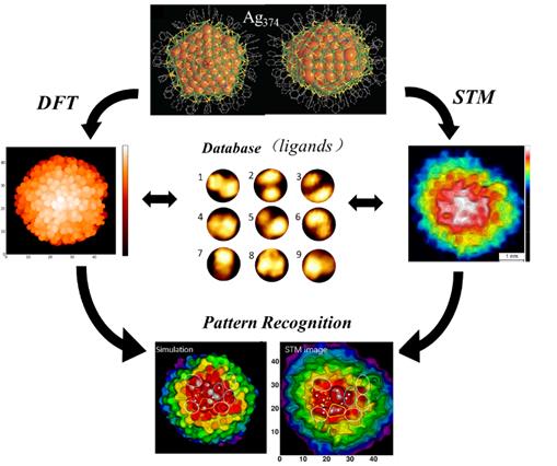 纳米颗粒的实空间成像对于理解颗粒尺寸、形状、组装、结构以及稳定性之间的关系具有十分重要的意义。因为这些基本特性决定了团簇颗粒在诸多应用如催化、药物传递、生物感应以及医疗诊断上的功能。研究者们通过扫描隧道显微镜(STM)以及原子力显微镜(AFM)已经对平面上的有机分子进行了大量原子级分辨率的研究,然而对于纳米颗粒表面有机层的成像却极具挑战。首先,因为高曲率的纳米颗粒表面会导致强的针尖卷积效应,扭曲纳米颗粒尺寸及形状;其次,对于未知结构的纳米颗粒,通过STM分析同样结构未知的表面有机物层难度极大,而且也难以通过理论模拟出准确的 AFM 或者 STM 图像。在该研究工作中,合作团队以原子结构精确的 Ag374纳米团簇作为研究对象,利用超高真空扫描隧道显微镜分别在液氦及液氮温度下获得了单个团簇亚分子高分辨率的拓扑图像。结合液氮温度下单个叔丁基苯硫酚(TBBT)分子在 Au(111)表面的高分辨 STM 图像以及 Ag374的计算模拟STM 图,证明 Ag374的高分辨 STM图中呈现出了单个 TBBT 的形貌,并且可分辨出单个甲基基团。随后,借助“图像识别”原理,通过 STM 模拟图像数据库以模板识别方法找到了高度匹配的团簇取向,此工作为将来基于应用设计功能性纳米团簇提供了指导与帮助。